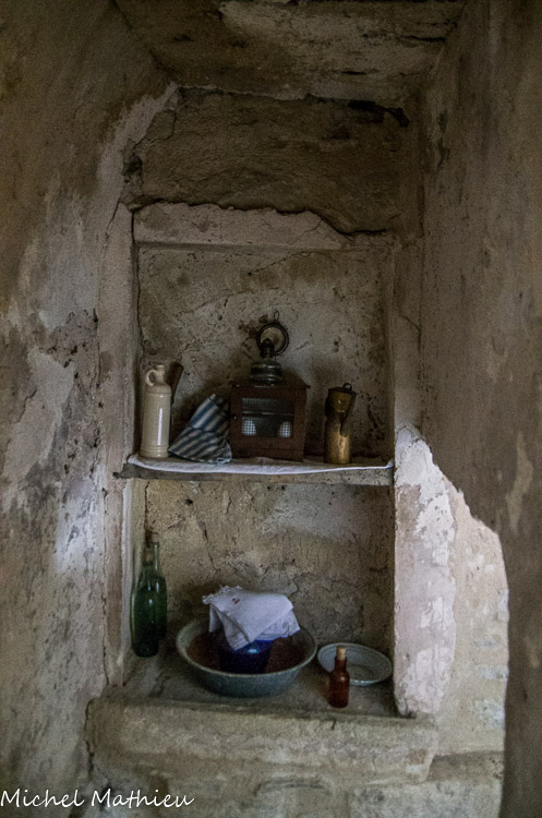 La Chapelle Saint-Jean-de-Fuzils L'ermitage. Dans une niche du couloir d’accès à l’étage, un peu de matériel pour se laver.