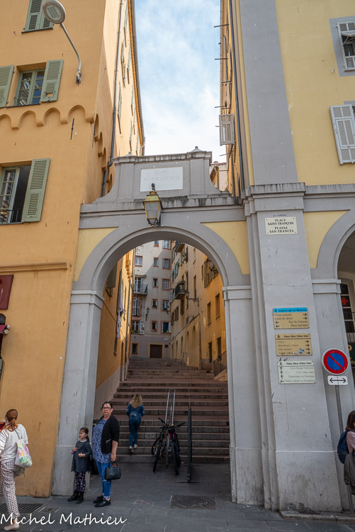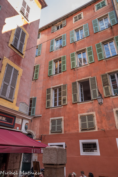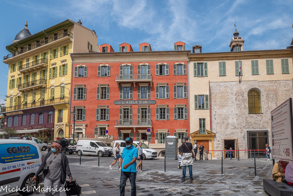 Place Saint-François. En face, salle des Ftranciscains. Édifice patrimonial majeur de l'histoire de Nice, ce couvent des Franciscains a vu le jour au XIIIe siècle et a connu une vie mouvementée. Désacralisé lors de la Révolution, il est devenu tour à tour écurie, appartements, boîte de nuit, cinéma et bâtiment des services municipaux. Ses murs sont bruts, son passé est riche et il retrouve, en avril 2022, toute sa superbe en devenant une des salles du Théâtre National de Nice. Le bâtiment de "L'Aigle d’or" (lors du découpage en 1792, il était devenu un ancien relais de poste) regroupe en son sein les bureaux administratifs du TNN, 2 salles de répétitions (100 m² chacune), un foyer des comédiens ainsi que des appartements mis à disposition des artistes accueillis eu en résidence.