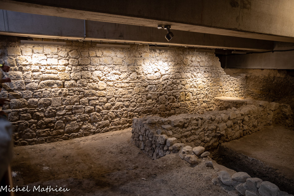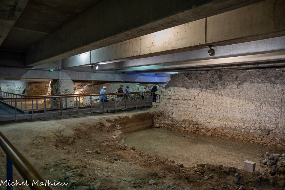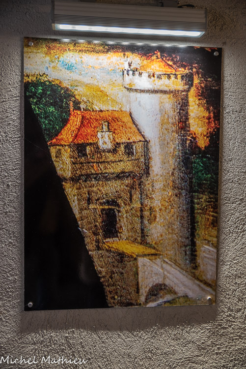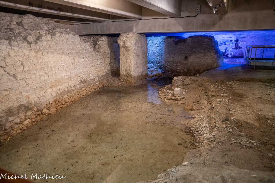 En haut, à droite, le château et la citadelle. A gauche, en rouge, l'endroit où nous sommes, l'ancienne porte de Pairolière. La Crypte est une salle souterraine de 2 000 m² située sous le boulevard Jean-Jaurès et la place Garibaldi, le long du fleuve du Paillon. Ce sont les fouilles archéologiques lors de la construction de la première ligne du tramway de la Métropole Nice Côte d’Azur, en 2006, qui ont permis de dégager des vestiges très bien conservés, autour d’une des entrées principales de la cité, la porte Pairolière, et de mettre en lumière de façon exceptionnelle l’histoire de Nice depuis le Moyen-Âge en tant que place-forte du comté de Provence puis du duché de Savoie.