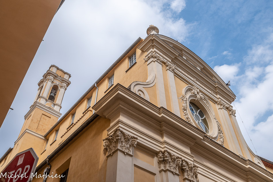 Chapelle de Saint-Érasme. Chapelle corporative des marins, XVIIe siècle. À Nice, saint Érasme (ou saint Elme) est le protecteur des marins, comme en témoigne le cartouche au-dessus du tableau central. Toute la thématique décorative de la chapelle tourne autour de cette corporation. Saint Érasme lui-même, dans le tableau central (XVIIe siècle, anonyme), étend sa main droite pour presque saisir un navire en perdition. En observant attentivement ce navire, on a le sentiment que, par sa forme, il est bien postérieur au XVIIe siècle, date probable du tableau. De fait, le pavillon qui orne sa poupe est le pavillon civil de Sardaigne adopté en 1814. n peut donc supposer que ce navire a été ajouté au XIXe siècle sur la toile originale, peut-être en ex-voto, par un marin reconnaissant à saint Érasme de l’avoir protégé de la colère des flots. Aux pieds de Saint Érasme, les angelots tiennent aussi des instruments de navigation.