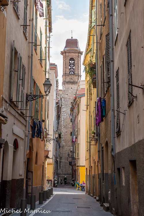 Rue de la croix. Clocher de l'église du Gésus (42m de hauteur) est construit en briques apparentes, à la façon piémontaise. Il est couvert d’un toit en forme de chapeau de gendarme recouvert de tuiles colorées et vernissées à la mode génoise.