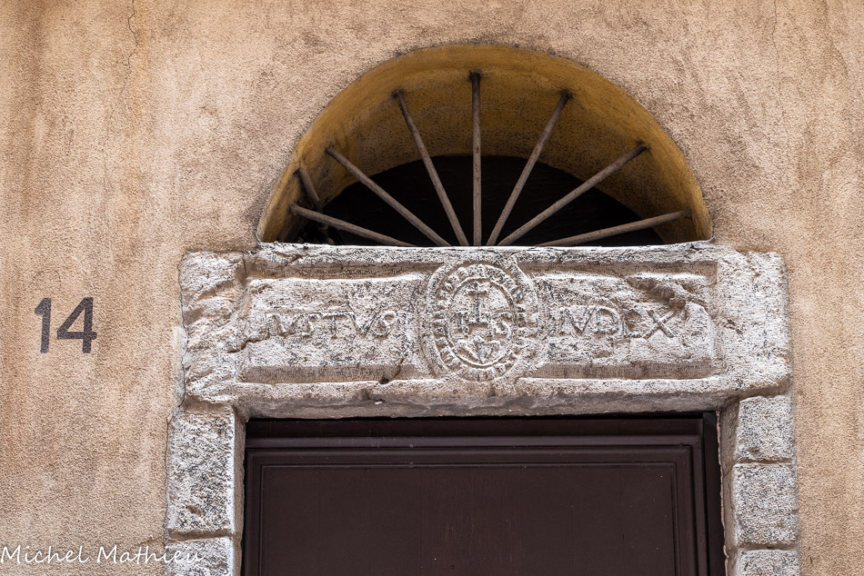 Deux devises, in hoc signo vinces ( « Par ce signe tu vaincras. » ) et o crux ave, spes unica ( « Salut, ô croix, unique espérance. » ), rappelle la dévotion de l'archiconfrérie de la Sainte-Croix.
