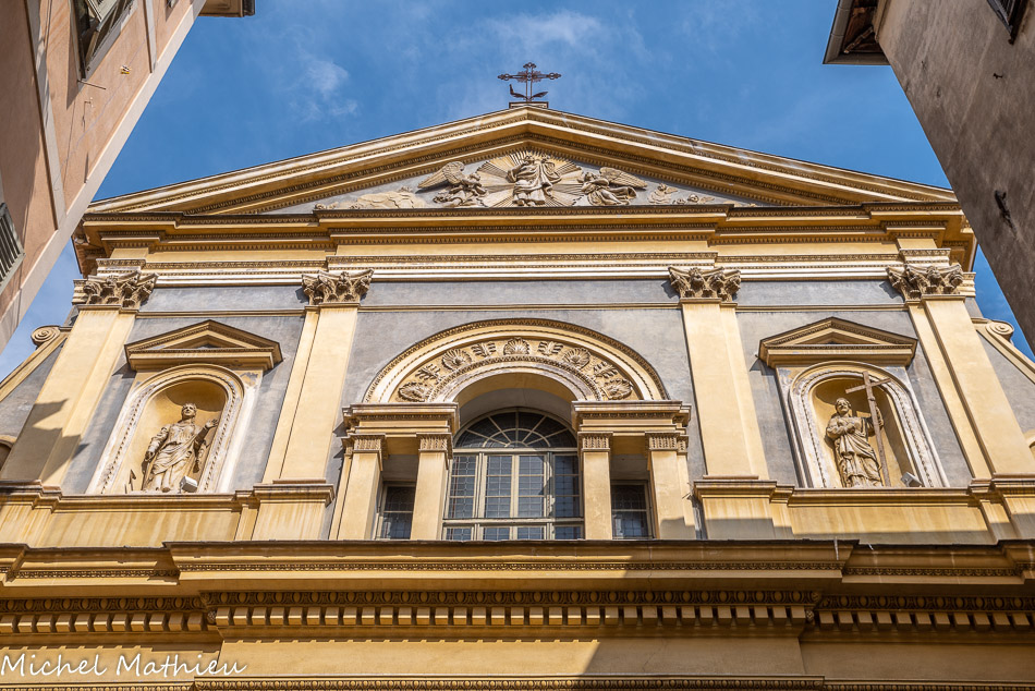L'Annonciation, 1829. Œuvre du peintre russe K.A. CHEVELKINE, ce magnifique tableau de l'Annonciation a été offert à l'église par le Général niçois Alexandre MICHAUD à la suite de l'incendie du 16 juillet 1834, qui avait détruit le précédent tableau figurant la Transfiguration. Le Général avait lui-même reçu cette Annonciation du Tzar ALEXANDRE 1er en reconnaissance de sa fidélité. Depuis cette date l'Église, dont le titulaire était auparavant Saint Giaume (Saint Jacques), porte le nom de l'Annonciation.