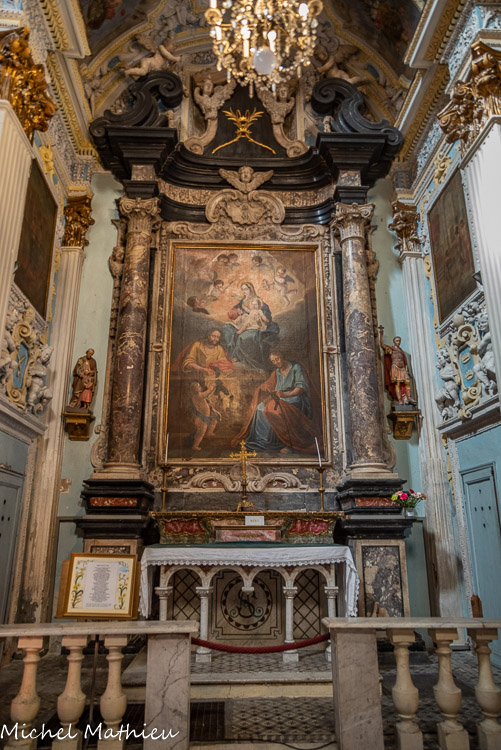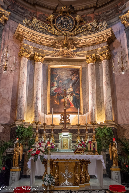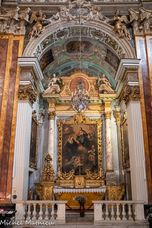 Chapelle Notre-Dame-du-Mont-Carmel. L’ensemble décoratif est dominé par la magnifique statue mouvementée en marbre blanc de la Vierge et l'Enfant, présentant tous deux le scapulaire. Elle est l’œuvre du Génois J.B. Ansaldi (vers 1760-1771). La blancheur diaphane de la statue est rehaussée par les teintes soutenues du fond de la niche. Elle est encadrée par deux colonnes torses de marbres polychromes.