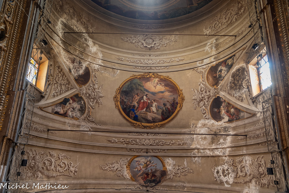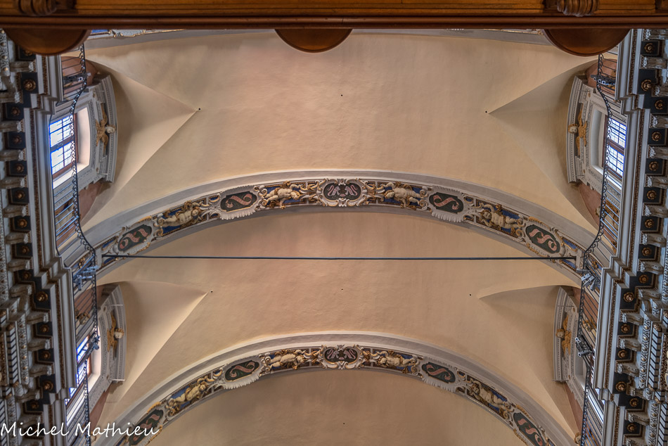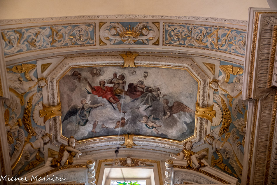 Chapelle de Sainte-Rita. Le souvenir de Notre-Dame-des-Sept-Douleurs est évoqué par les instruments de la Passion peints sur la voûte. Au-dessus de l'entablement, le voile de la Sainte Face de sainte Véronique.
