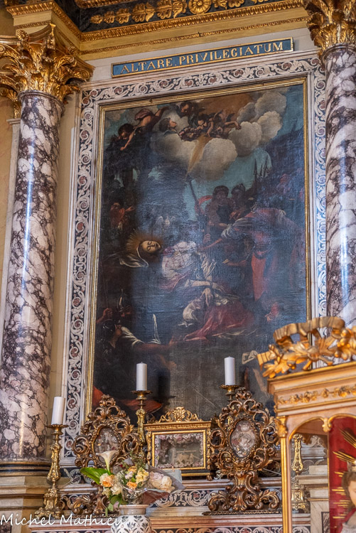 Chapelle des Quatre-saints-couronnés, de la corporation des maçons. Le tableau de droite, peint au XVIIIe siècle, figure saint Séraphin de Montegranaro, maçon devenu capucin, mort en 1604, canonisé en 1767.