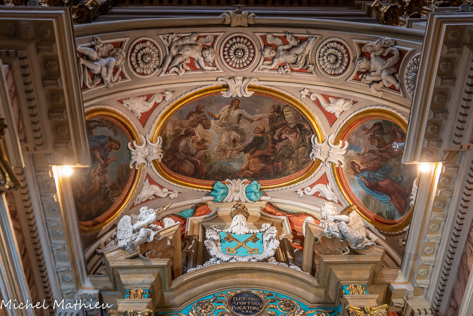 Chapelle de Saint-Pierre. Chapelle de Saint-Pierre. A la voûte, les mêmes thèmes sont décliné : à gauche, Jésus donnant à Pierre le pouvoir de lier et délier, au centre, L'ascension (pour moi, c'est plutôt la Transfiguration : le Christ transfiguré entre Élie (les livres des Prophètes) à sa droite et Moïse (le Pentateuque) à sa gauche, et en bas de gauche à droite, les apôtres Jacques, Pierre et Jean.), à droite, La Vocation de Pierre. En-dessous, les clés qui représentent le pouvoir que Jésus lui donna de « lier et délier sur terre et dans les cieux ».