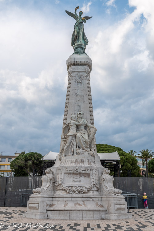 Monument du centenaire de la réunion de Nice à la France. Une Victoire ailée se dresse au sommet de l’obélisque, enveloppée dans un drapeau français et prêtant serment de fidélité, allusion à la devise de la ville « Nissa fidelissima ». ; au pied, la France assise enlace du bras droit Nice qui vient à elle. La France ne porte pas de bonnet phrygien mais un casque et son sein n’est pas dénudé. Son allure est calme, ce qui l’associe à l’idée d’ordre. C’est donc une République modérée, prudente et légaliste, à la fois maternelle, rassurante et pacificatrice. La ville de Nice est coiffée de ses murailles, reprenant ainsi une vieille représentation médiévale. On peut y voir une allusion à la dédition de la ville aux comtes de Savoie en 1388, ce qui présenterait la réunion de 1793 comme une sorte de nouvelle dédition, à la France cette fois. Sur la face avant de la pyramide figurent les dates 1793-1893 et en dessous : 1860. Le monument a donc pour but de commémorer non seulement la réunion de 1793, mais également celle de 1860. L'architecte est Jules Febvre, le sculpteur André Joseph Allar, le fondeur Capitain-Gény .