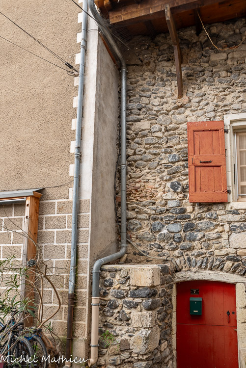 Rue du Four. La particularité d’Aps et de La Roche c’est son architecture mêlant le basalte, pierre noire d’origine volcanique, et le calcaire, pierre blanche, dont une partie est récupéré sur les ruines de l’ancienne cité antique d’Alba. Ces pierres calcaires déjà taillées étant utilisées le plus souvent pour l’encadrement des portes et des fenêtres, pour la construction des escaliers, alors que le basalte plus difficile à tailler constituait en grande partie les murs.
