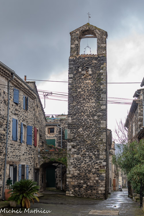 Le clocher mur à 3 ouvertures de l'église saint André. Après l'abandon de la cité romaine, il faut attendre le Moyen-Âge pour trouver mention d'une nouvelle agglomération à l'emplacement du village actuel. Au XIe ou XIIe siècle, un donjon, puis un château fort, furent édifiés sur le neck qui porte le château actuel. Des maisons commencèrent à se grouper à son pied, amorce d'un village castral.