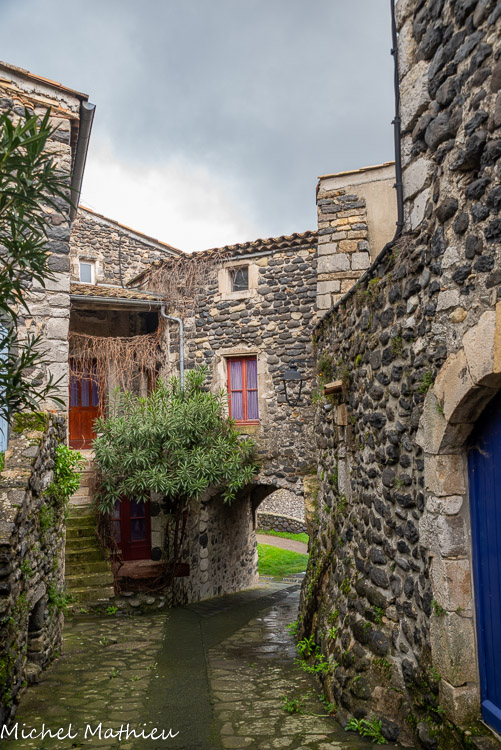 Rue du Four. Le bourg médiéval s’est construit en arc de cercle autour du château érigé sur un neck volcanique. Il se parcourt par un réseau de ruelles dallées.