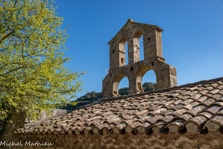 Clocher-peigne (ou clocher-mur) percé de trois bai. Un petit clocheton en maçonnerie a été rajouté au-dessus du clocher-peigne plus récemment.