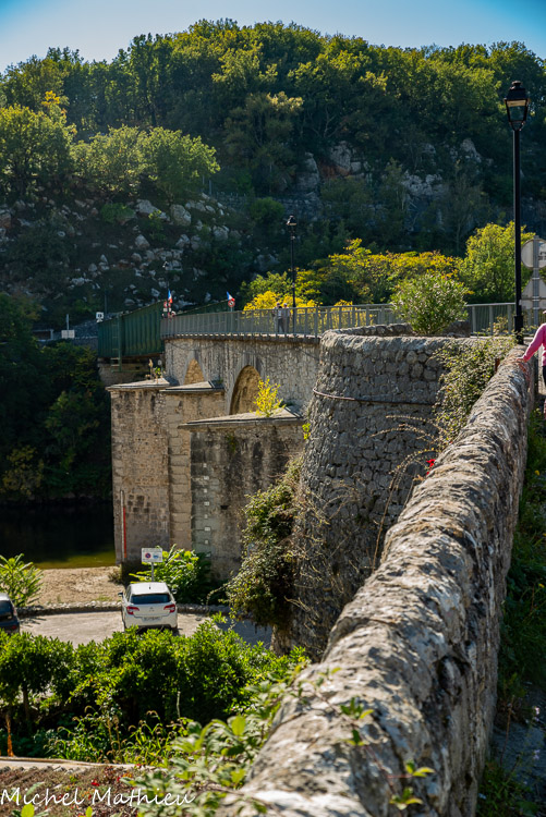 Pont de la route des Gras. Balazuc est accroché aux falaises qui bordent l'Ardèche, dans le Vivarais méridional. Le cours de l'Ardèche forme une frontière naturelle entre la vallée du Rhône et le Massif central. Balazuc s'est installé au niveau d'un passage à gué naturel, longuement emprunté avant d'être supplanté par la traversée en bateau, puis par le pont.