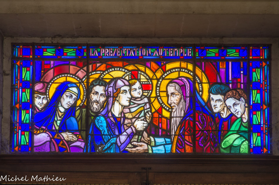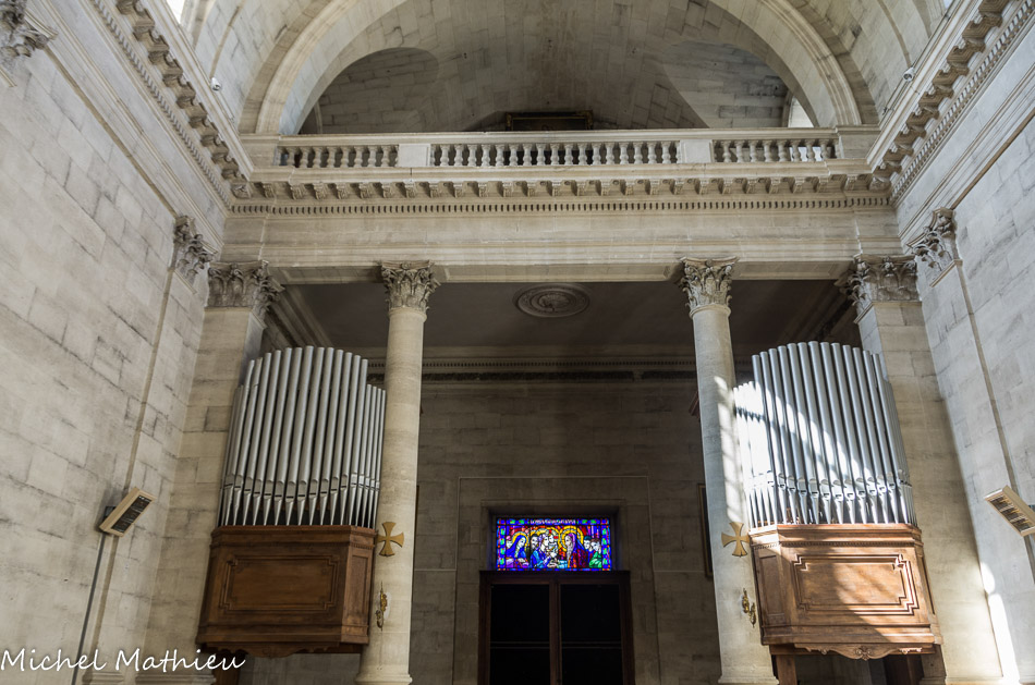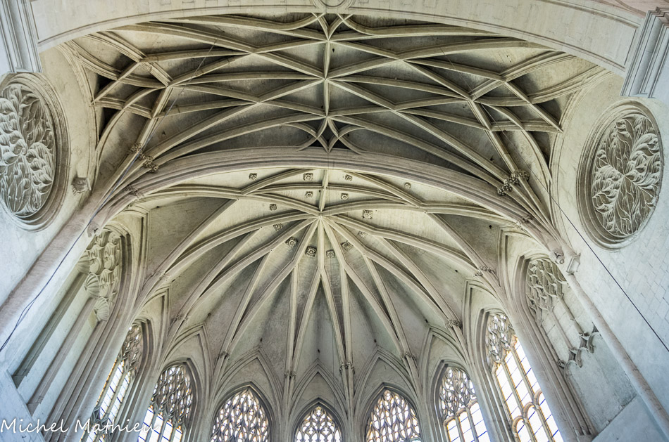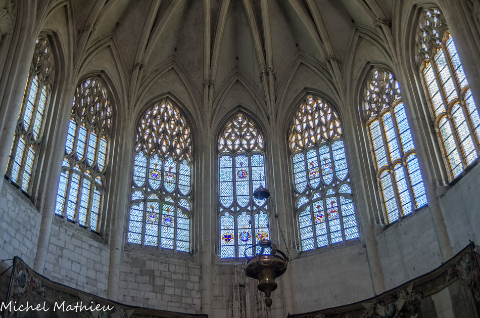 Neuf baies élancées éclairent le chœur, décoré de deux grandes rosaces aveugles.