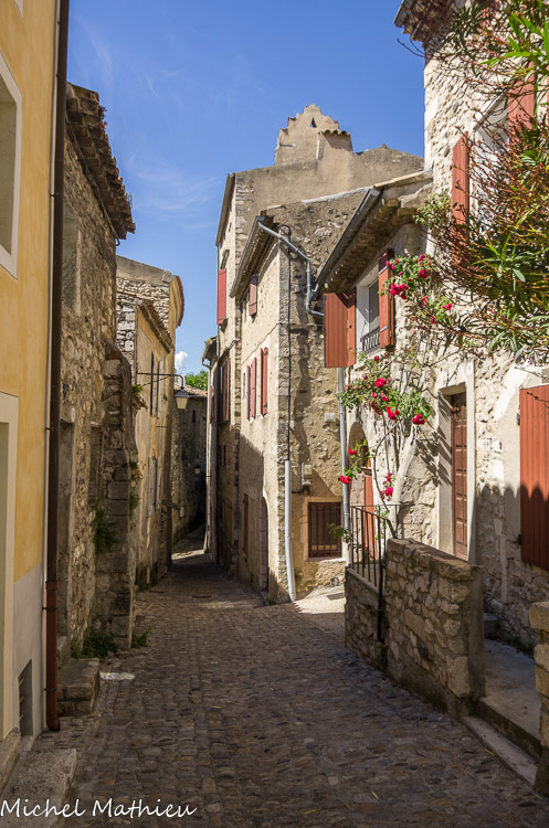 D'un côté de la rue, à gauche, on peut apercevoir la façade d'une maison romane avec une série de trois baies jumelées.