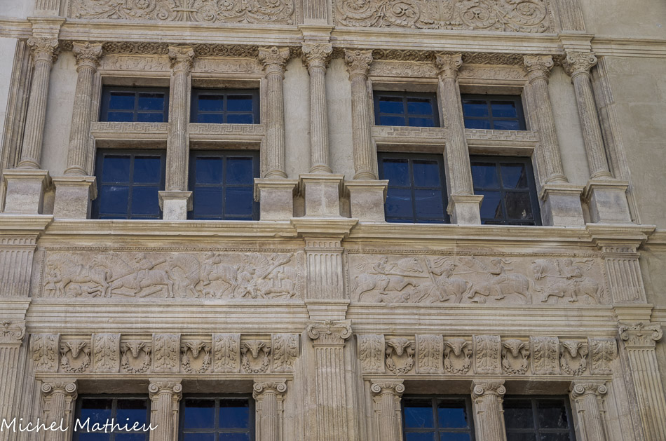 Maison des chevaliers. Les trois autres étages sont organisés de façon rigoureuse. Les lignes verticales sont assurées par des supports d'ordre ionique au premier étage, composite au deuxième, termes (personnages engainés) au dernier. Trois frises structurent les étages : bustes en médaillons alternant avec les armoiries surmontées de heaumes, tournois de chevaliers, rinceaux de feuillages.