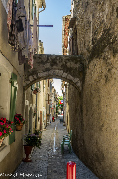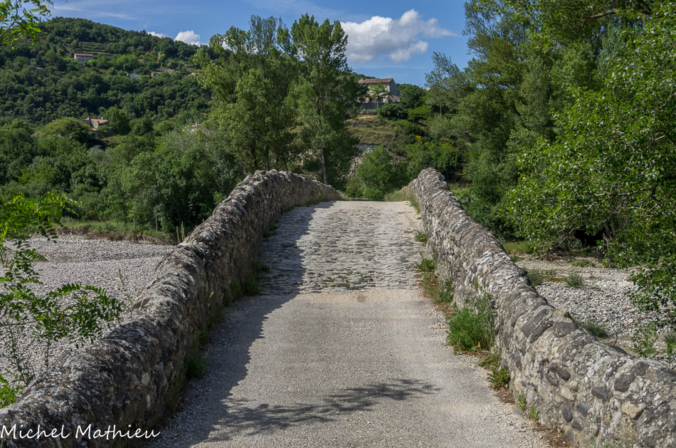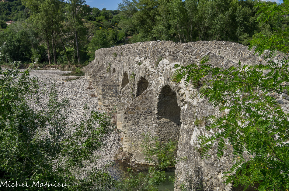 Le pont romain, passage sur l'Escoutay. Il a été souvent remanié : les éperons des piles ont été ajoutés après coup, les deux grandes arches côté rive gauche sont du XVIIIe siècle.