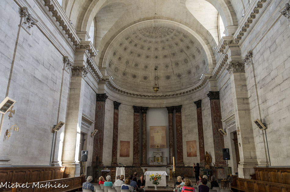 La chapelle. Mais il manquait une grande chapelle. Il fut évident qu’elle devait faire face à l’aile de philo. M. Vernet en avait conçu les plans tout comme pour l’aile de philo. Tout le revêtement intérieur est en pierre de St Paul Trois châteaux. Les pilastres, colonnes et sous bassement en marbre noir et rose.