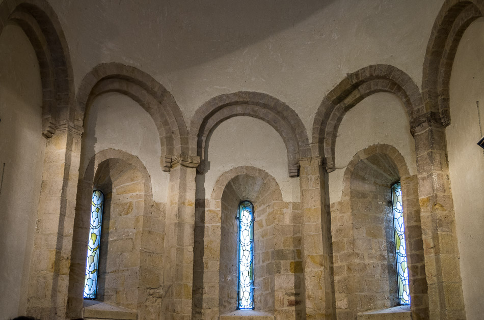 Des vitraux modernes obturent trois baies absidiales.