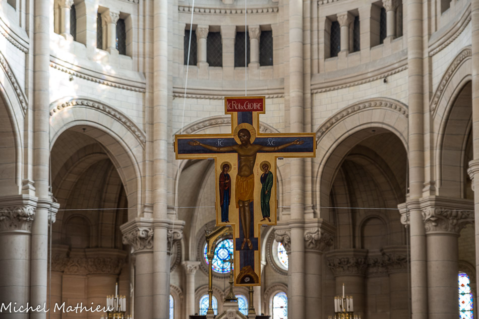 Architecture du chœur. On retrouve le style de la nef : arcades en plein cintre, piliers ornés de chapiteaux stylisés et colonnes semi-engagées qui viennent couper les chapiteaux. La clôture du chœur est concrétisée par une série de stalles assez simples. Soubassement du maître-autel : Peintures émaillées sur cuivre dues à Triouillé (dessins de Paul Balze). De gauche à droite : Saint Louis, saint Jean, la Vierge, sainte Madeleine et sainte Hélène
