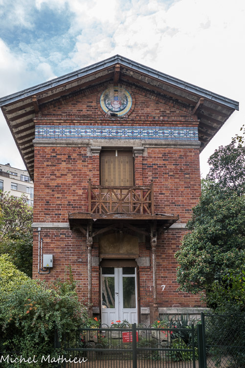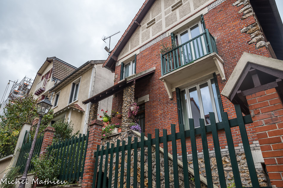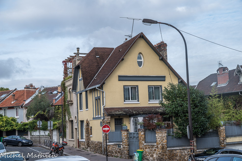 Plus bas à l’angle avec la rue de la Fraternité on aperçoit la villa de R. Fisher et sa toiture terrasse avec pergola, l’Art Déco côtoyant ici un pastiche « normand ».
