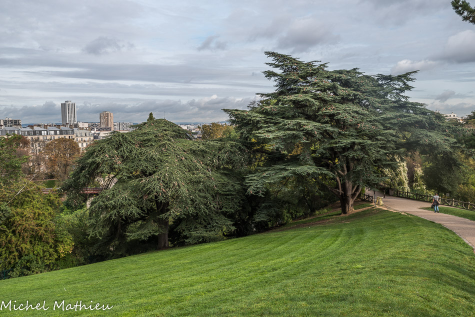 Ce cèdre, planté en 1880, imposant par sa taille et l’envergure de ses longues branches horizontales surplombe le parc des Buttes-Chaumont. Introduit en France en 1734, le cèdre est présent dans les parcs parisiens où il trouve l’espace suffisant pour se développer.