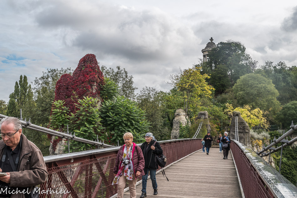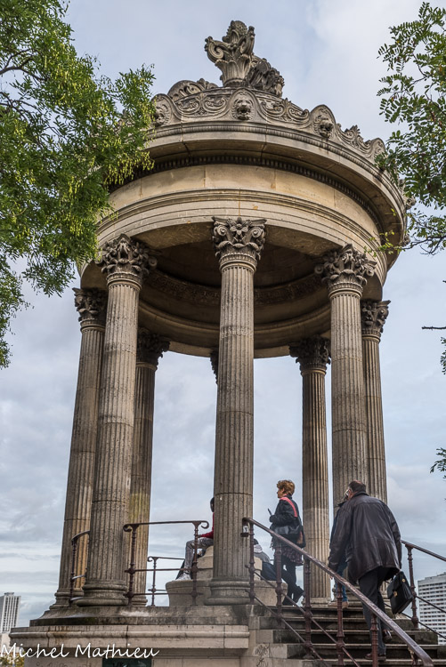 Temple de la Sybille, construit en 1869 par Gabriel Davioud, réplique du temple de Vesta à Tivoli à Rome. Il est situé à 30 mètres d’altitude. La passerelle suspendue conçue par Gustave Eiffel.
