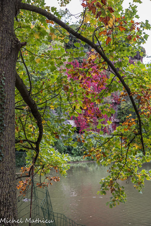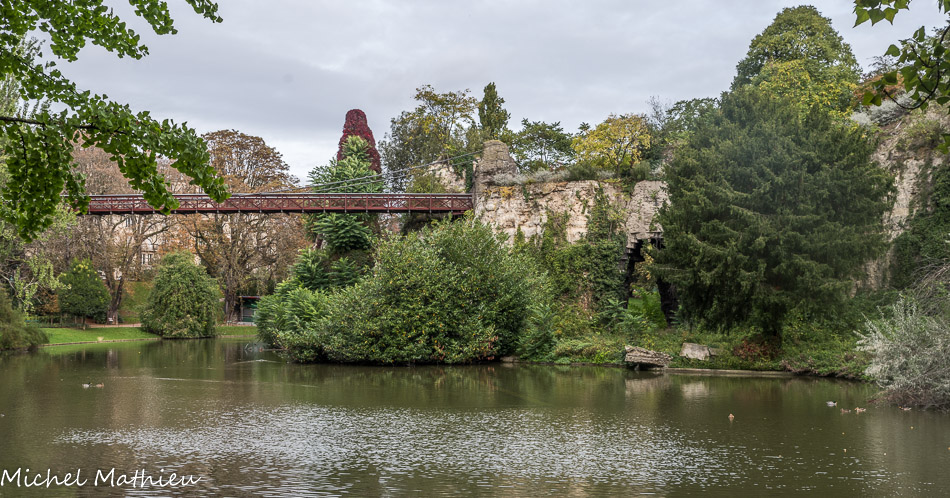 La passerelle suspendue conçue par Gustave Eiffel. Les reflets de l’île dans les eaux du lac rappellent les falaises d’Etretat, destination alors en vogue. Ce lac, de 1,5 ha de forme grossièrement circulaire et d'environ 150 m de diamètre, est alimenté par 3 ruisseaux qui descendent les pentes du parc, le premier à l'ouest, le deuxième à l'est et le dernier au sud.