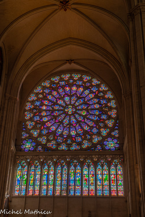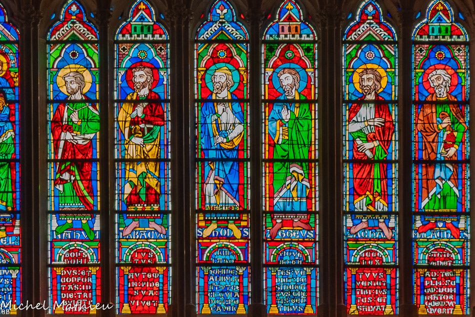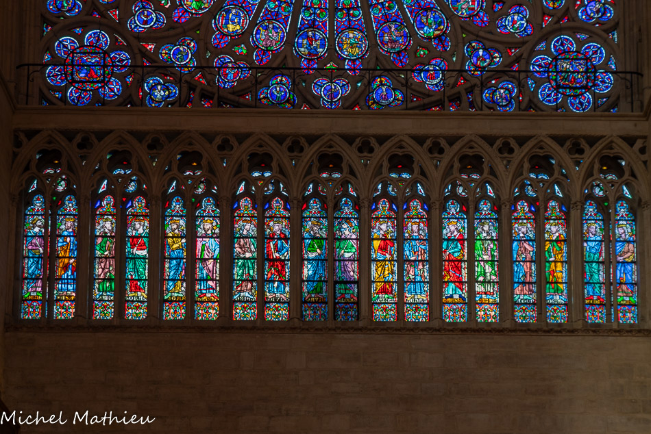 En 1965, les fenêtres hautes de la nef et les roses des tribunes ont enfin été garnies de vitraux colorés remplaçant les verres gris et ternes implantés par les chanoines au XVIIIe siècle. Non figuratifs, ils sont l’œuvre de Jacques Le Chevallier qui a utilisé les produits et couleurs du Moyen Âge. L’ensemble est à dominante rouge et bleue.