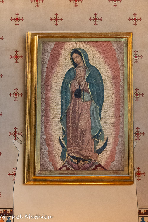 Au centre, une grande rose, dont le diamètre mesure presque 10 mètres, forme une auréole à la statue de la Vierge Marie qui est encadrée par deux anges et nous présente son enfant, Jésus, le Fils de Dieu.