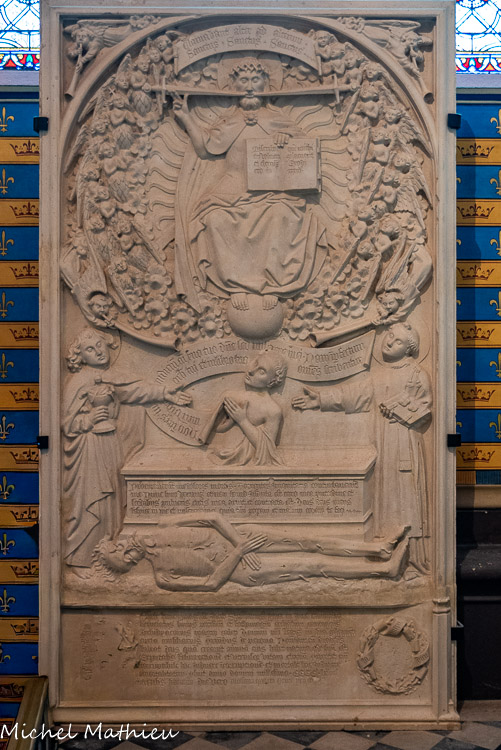 Il retrace, selon la tradition de l’Eglise, la mort de Marie, sa montée au Paradis et son couronnement en tant que reine du Ciel. A droite, allégorie de l'Egise.