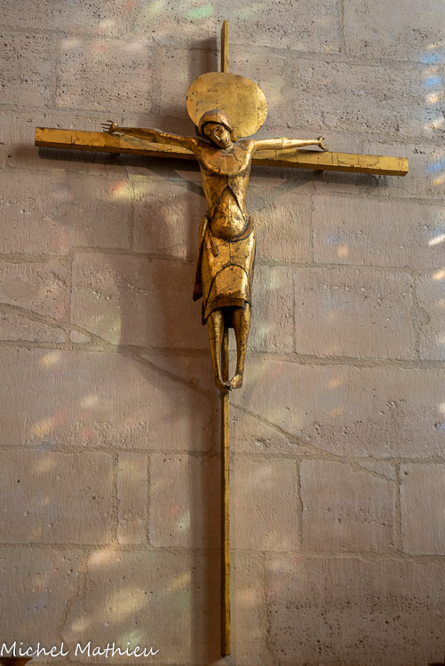 Cependant le Christ au tympan, majestueusement assis sur son trône de gloire, montre les plaies de ses mains et de son flanc tandis que les deux anges qui l’entourent portent respectueusement les instruments de la Passion : celui de gauche la lance et les clous de la Croix, celui de droite la Croix elle-même. De chaque coté, Marie et Jean l’Evangéliste sont placés ici comme au pied de la Croix le jour de sa Crucifixion.