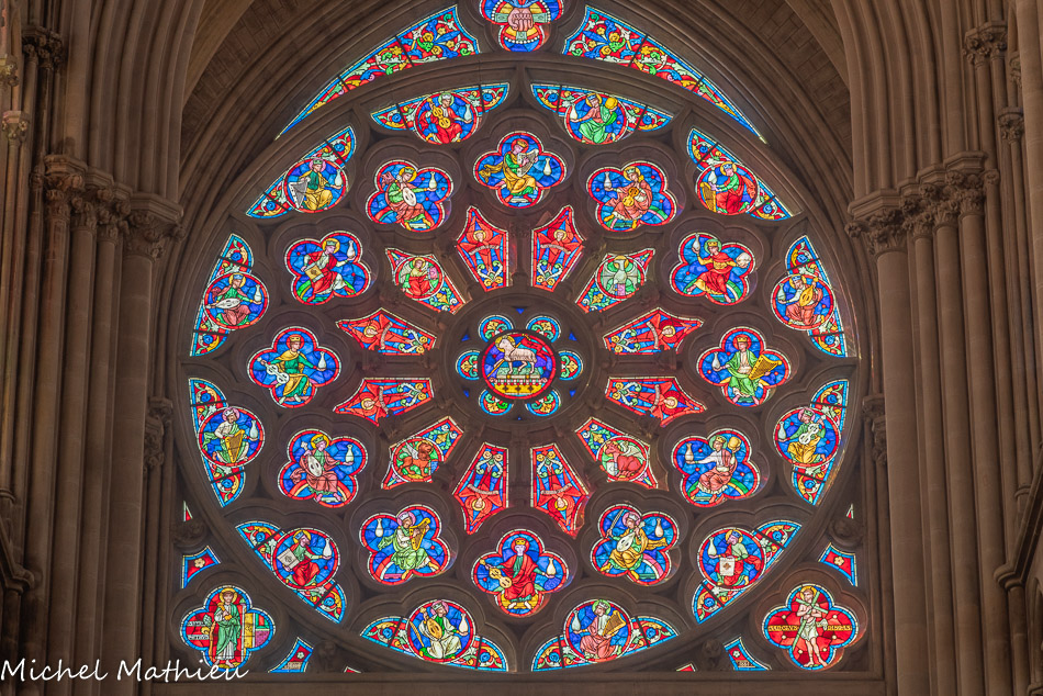 Rosace de la façade. La rose de l'espérance ou rose de l'apocalypse. Au centre, l'agneau aux sept sceaux, entouré de huit apôtres en séraphins en rouge et les allégories des quatre évangélistes. Autour, des rois musiciens. 2022