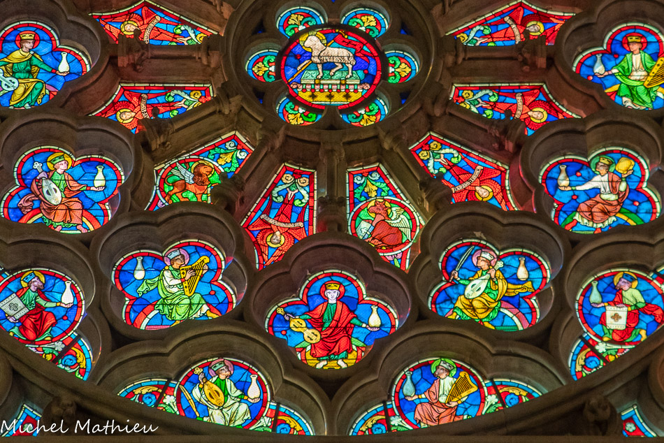 Rosace de la façade. La rose de l'espérance ou rose de l'apocalypse. Au centre, l'agneau aux sept sceaux, entouré de huit apôtres en séraphins en rouge et des allégories des quatre évangélistes. Autour, des rois musiciens .