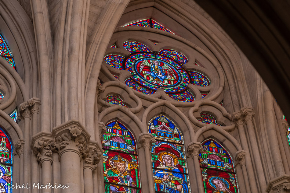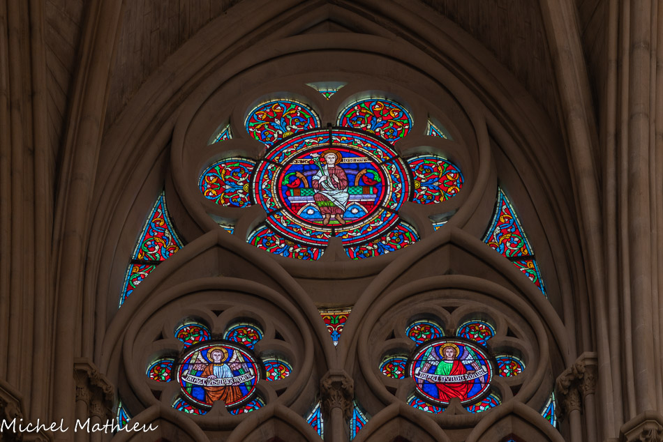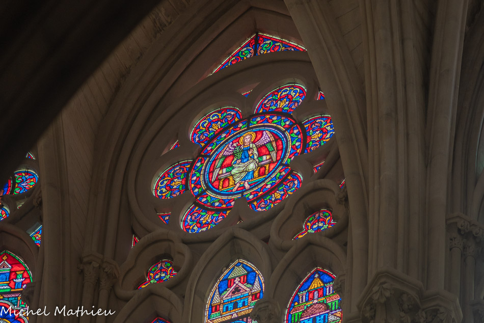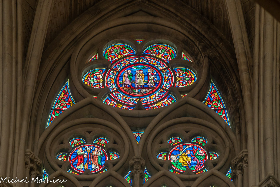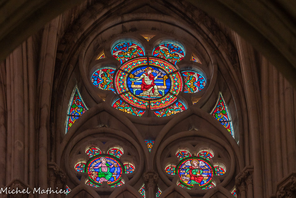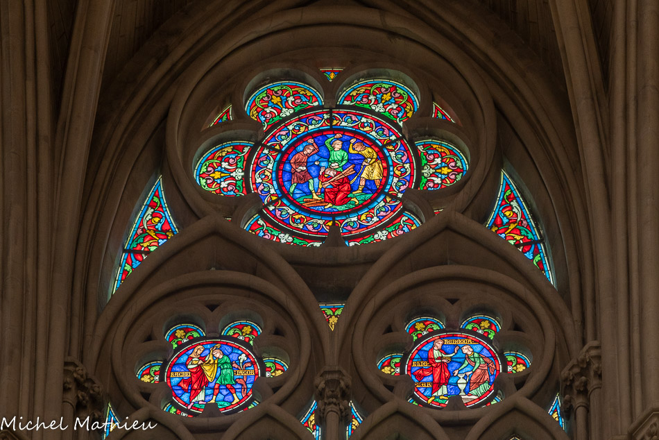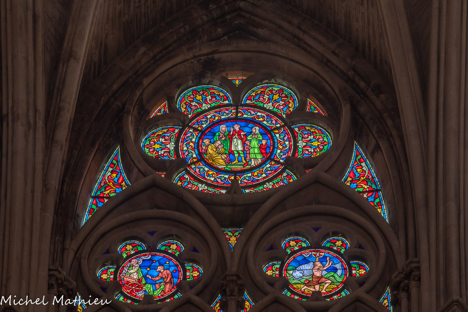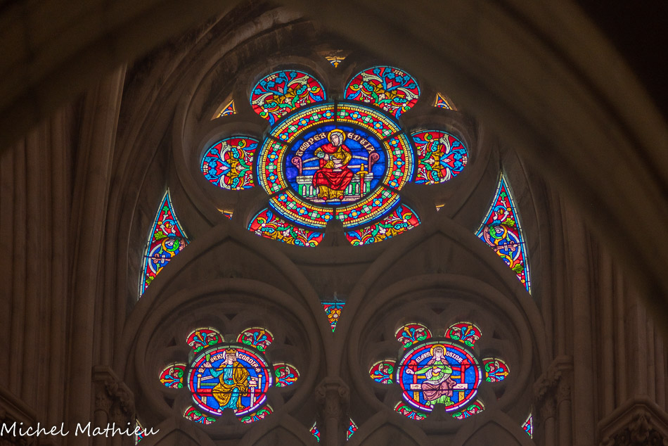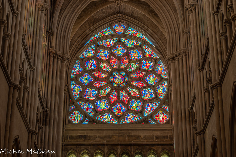 Transept droit. Les rosaces sont placées au-dessus des trois portails de l'église, ici la rose de la charité (ou rose de la Vierge).