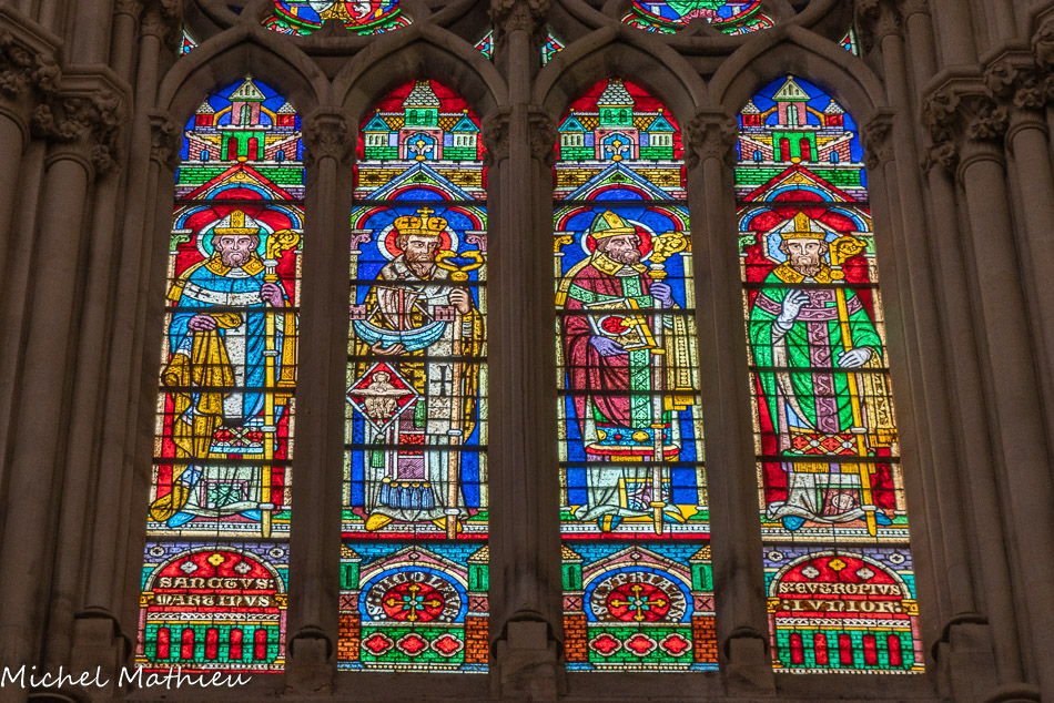 Vitraux du choeur à gauche. Saint Mauront, saint Canat, saint Serenus, saint Théodore.