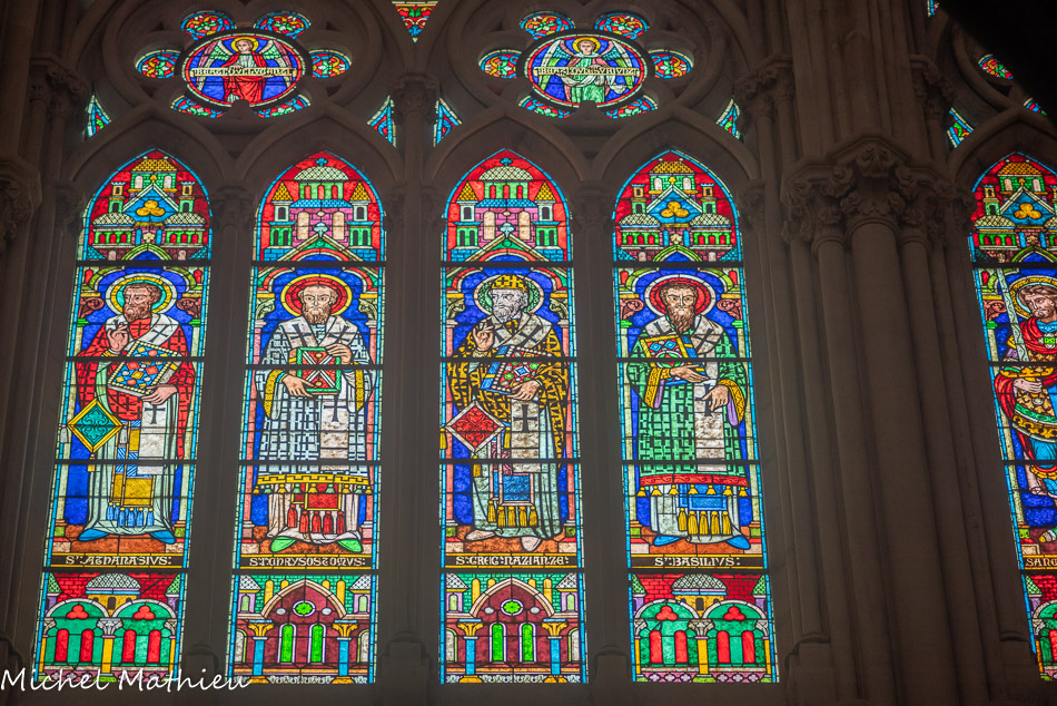 Vitraux du choeur à droite. Saint Athanase, saint Chrysostome, saint Grégoire de Nazianze, saint Basile.