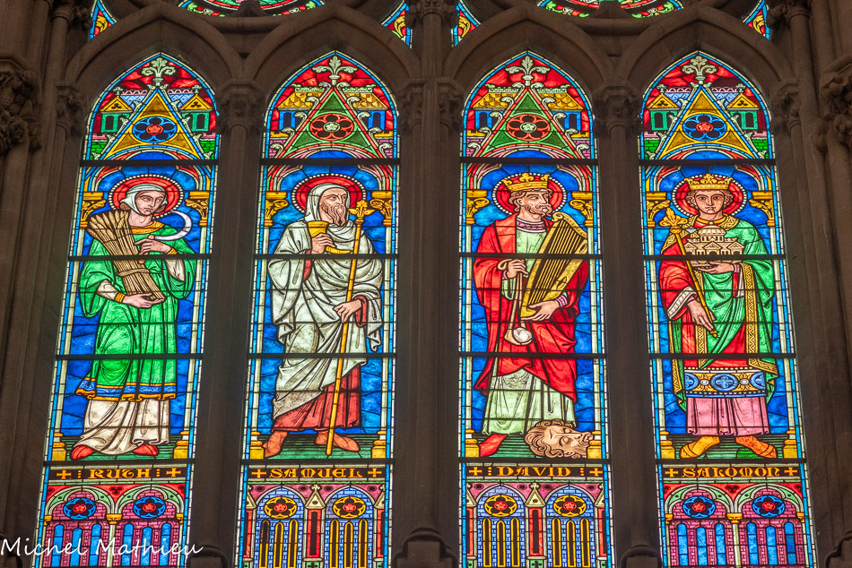 Vitraux de la nef, à gauche. Ruth, Samuel, David, Salomon.