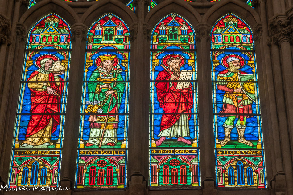 Vitraux de la nef, à gauche. Marie, Aaron, Moïse, Josué.
