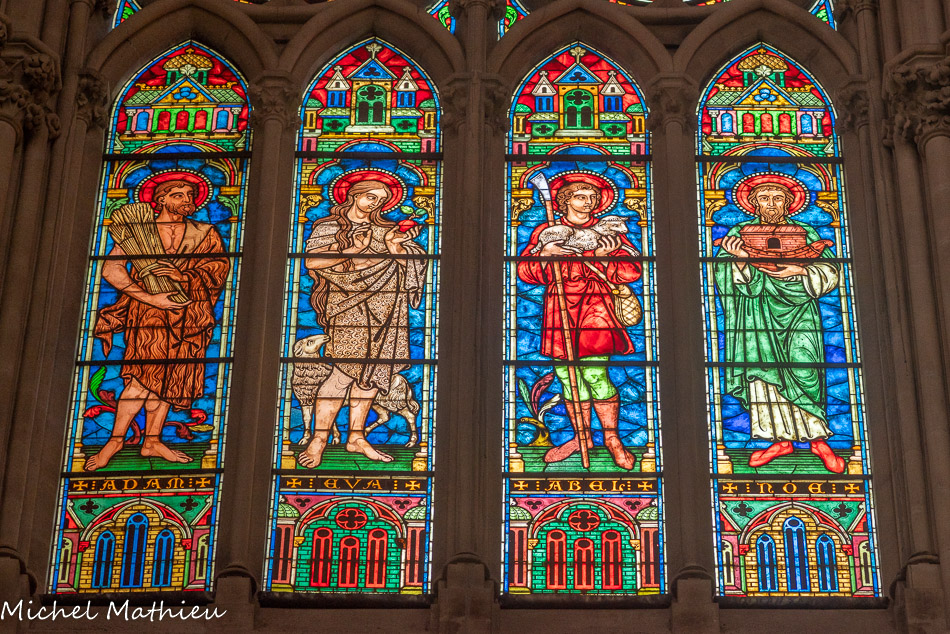 Vitraux de la nef, à gauche. Adam, Eve, Abel, Noé.