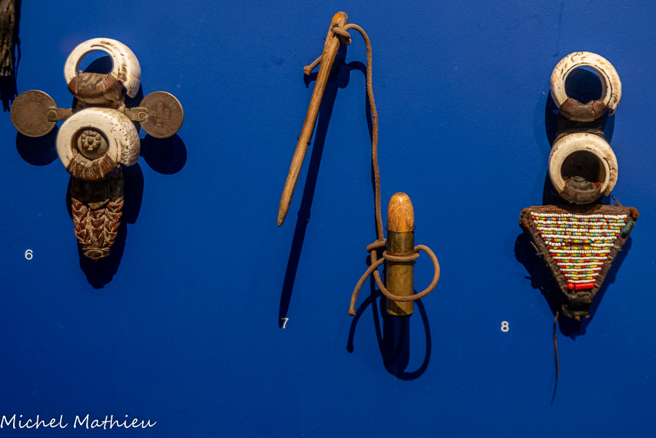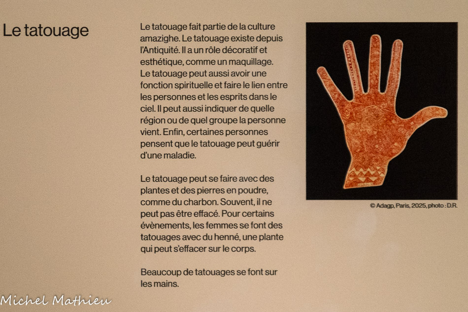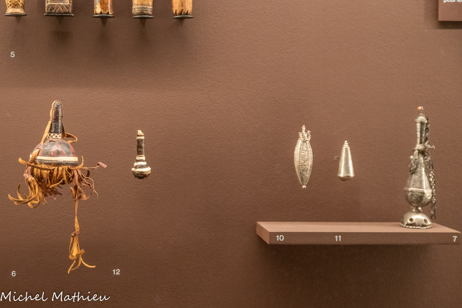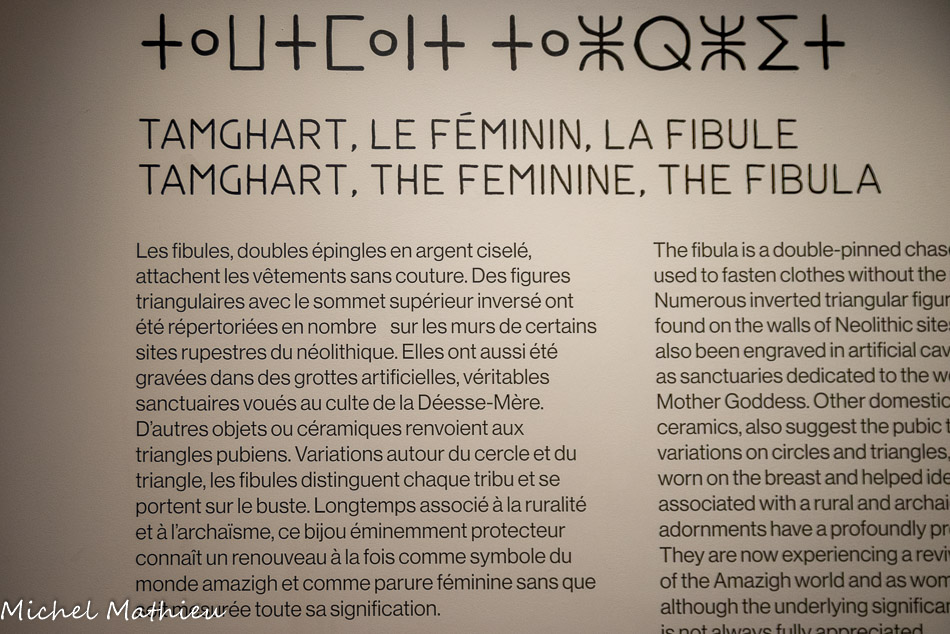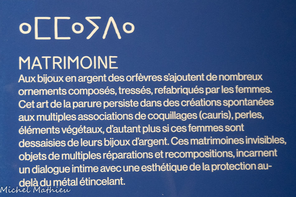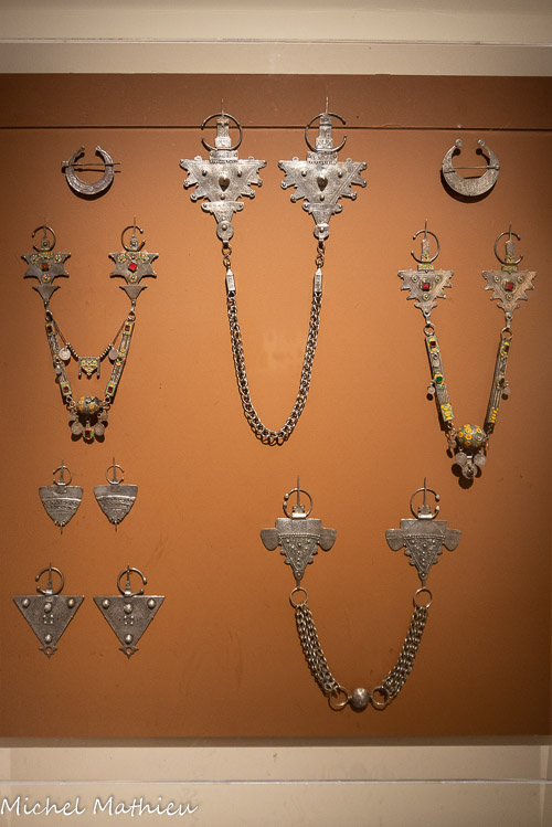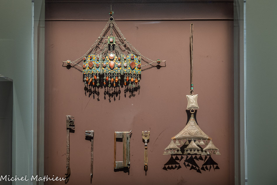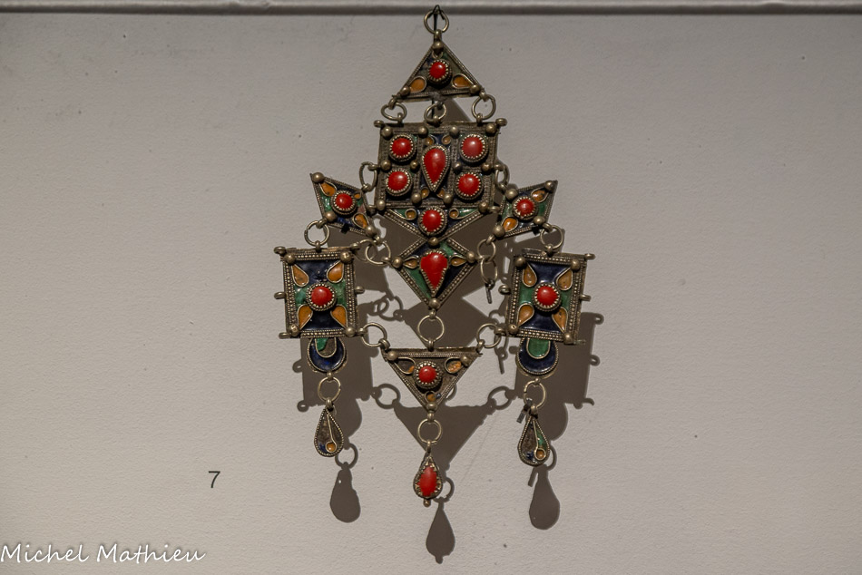 Cuir, argent, corail, cauris, pièces de monnaie Fondation Jardin Majorelle, Marrakech, Maroc