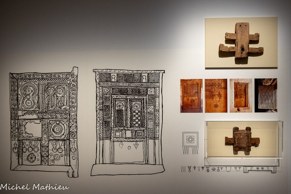 Dessins et photographies de portes de l’Anti-Atlas avec schéma des figures triangulaires stylisées et du carré central figurant un œil apotropaïque. Verrous.