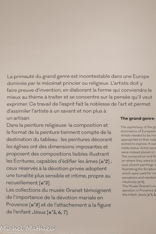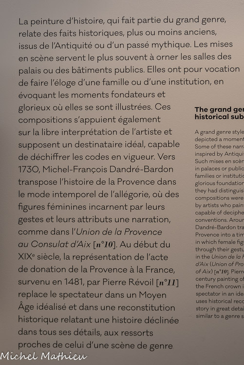 Le grand genre utilise une rhétorique visuelle, permettant d'assimiler la peinture à un discours efficace et bien lié. L'histoire des sujets est lisible à travers les corps et les visages des personnages, d'où le soin extrême apporté aux attitudes et aux gestes, au jeu des physionomies et aux accessoires. La réalité n'est copiée que pour être dépassée et transposée dans de nobles compositions.