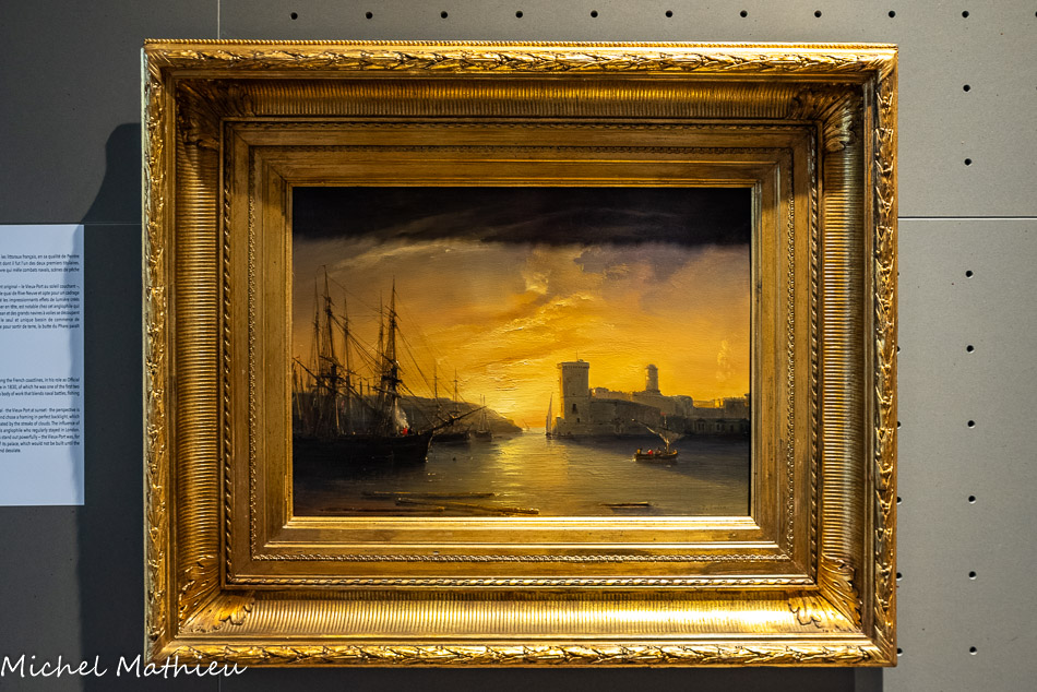 Si le sujet de cette œuvre de jeunesse n'est pas particulièrement original - le Vieux-Port au soleil couchant -, le point de vue adopté l'est davantage. L'artiste s'est installé sur le quai de Rive-Neuve et opte pour un cadrage en parfait contre-jour, qui lui permet de restituer avec dextérité les impressionnants effets de lumière créés par les traînées nuageuses : l'influence de l'école anglaise, Turner en tête, est notable chez cet anglophile qui séjourna régulièrement à Londres. Les silhouettes du fort Saint-Jean et des grands navires à voiles se découpent puissamment - le Vieux-Port est pour quinze ans encore, le seul et unique bassin de commerce de la ville. Dépourvue de son palais qui attendra le Second Empire pour sortir de terre, la butte du Pharo paraît curieusement vierge et désolée.