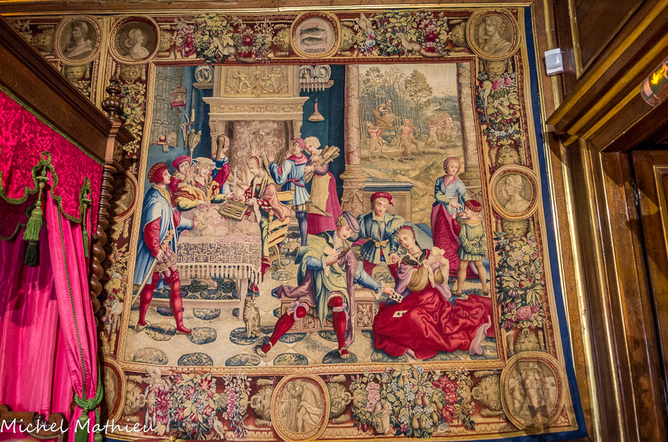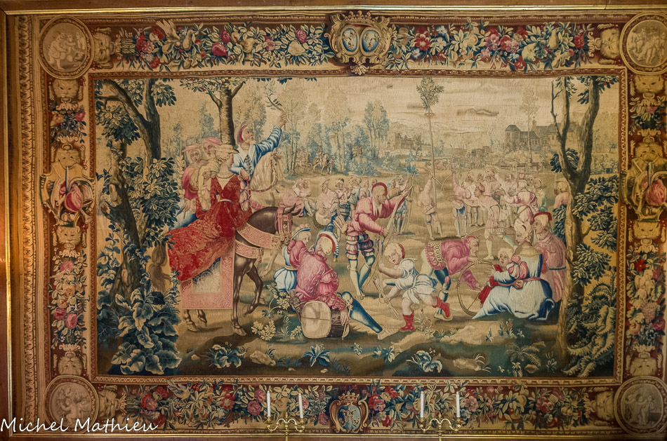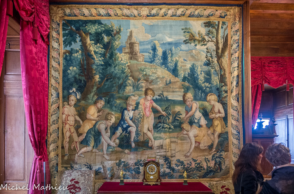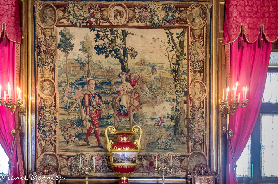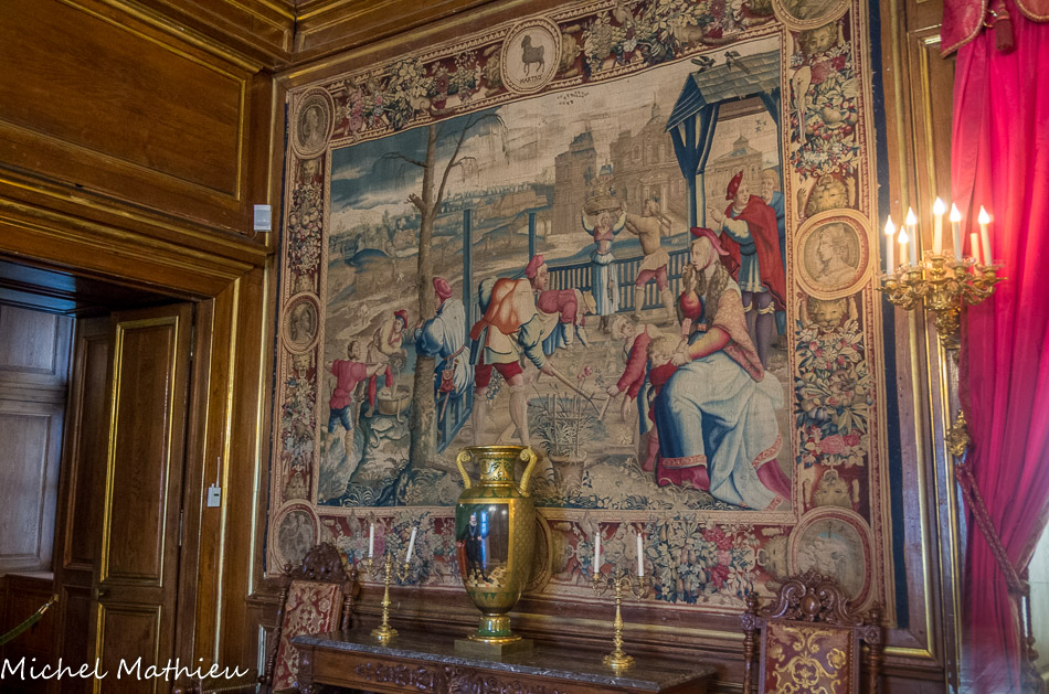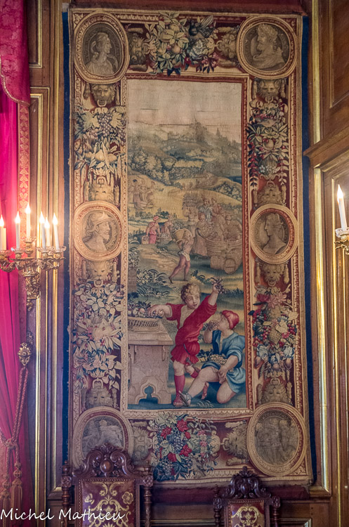 Le grand salon. Aménagé en 1842 et meublé par Jeanselme, le grand salon est décoré de tapisserie des « Mois Lucas » appartenant à deux suites différentes, toutes deux tissées au Gobelins, l'une au XVIIe siècle, l'autre au XVIIIe siècle pour la princesse de Conti. Statue de bronze d'Henri IV enfant, oeuvre de François Joseph Bosio.