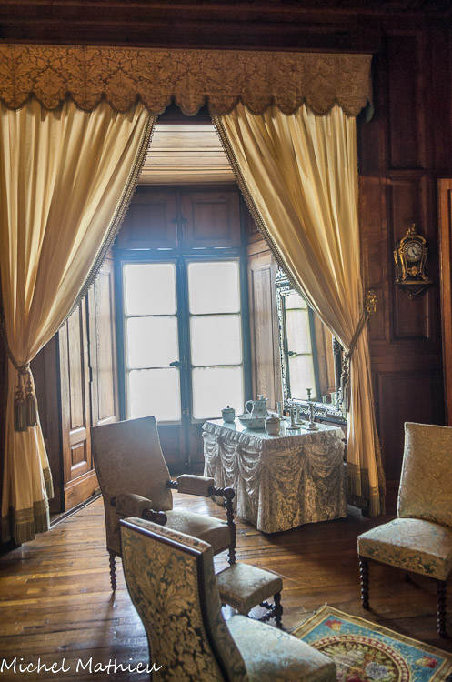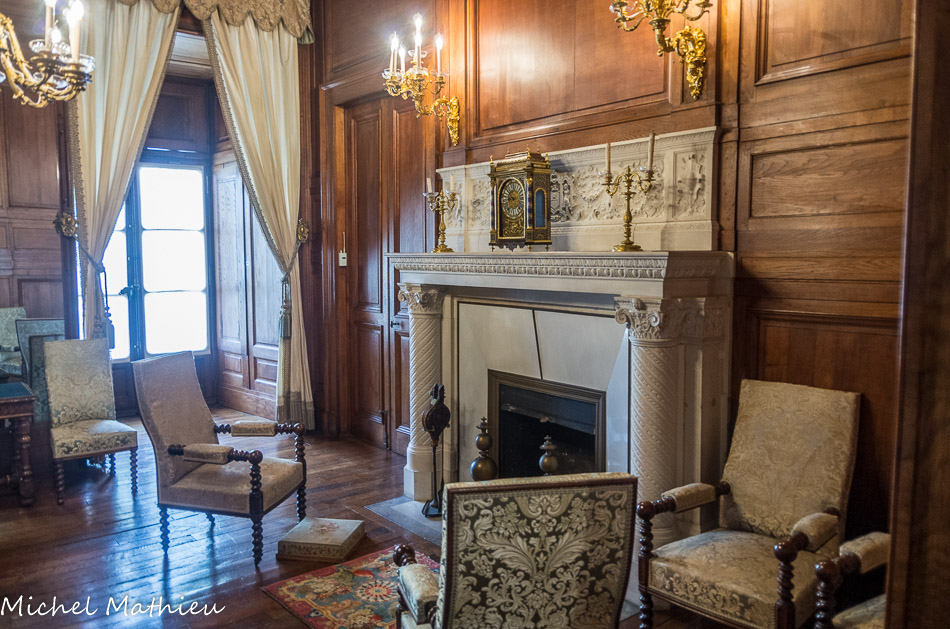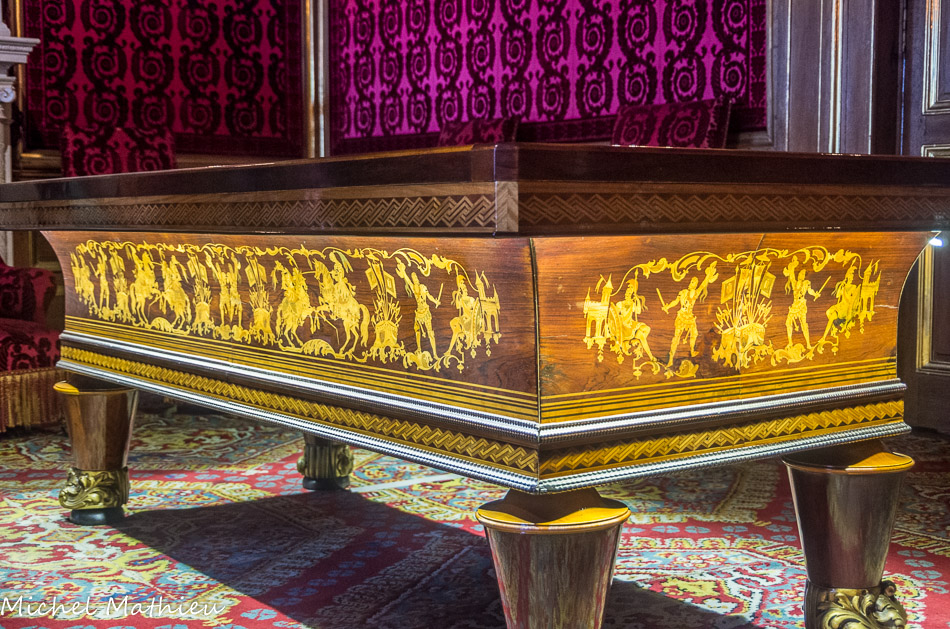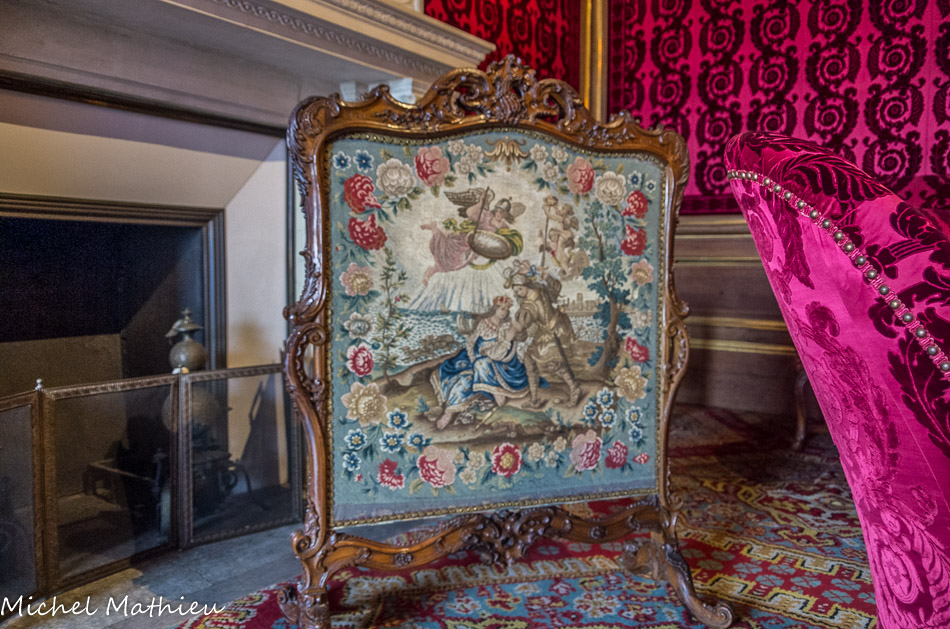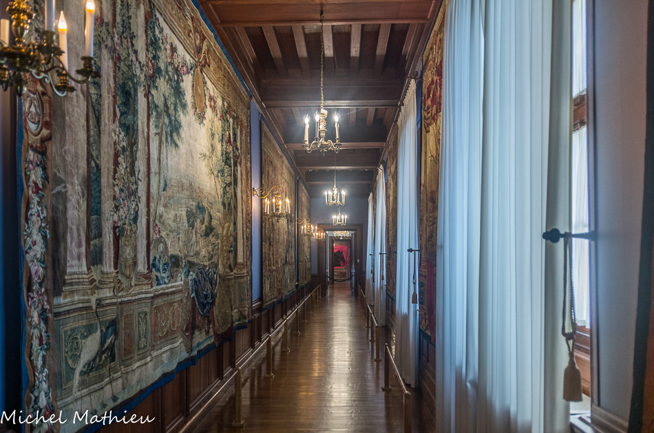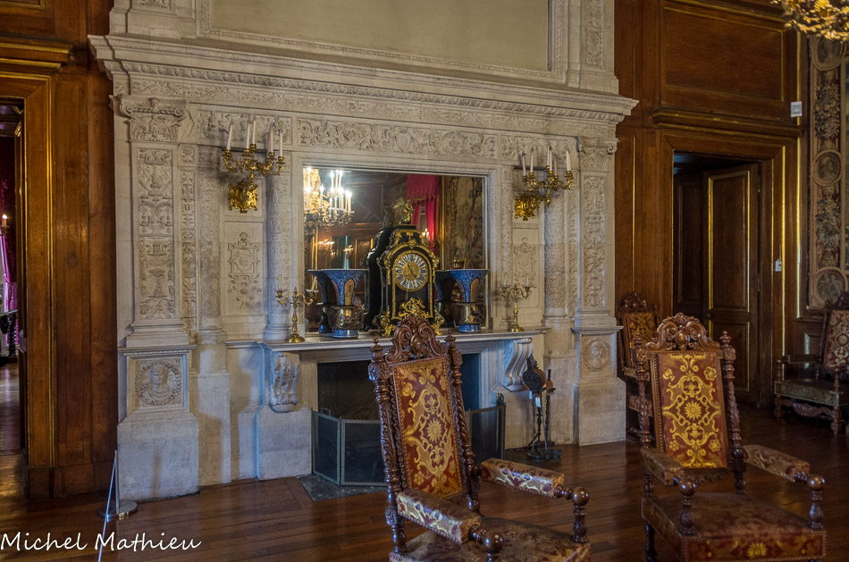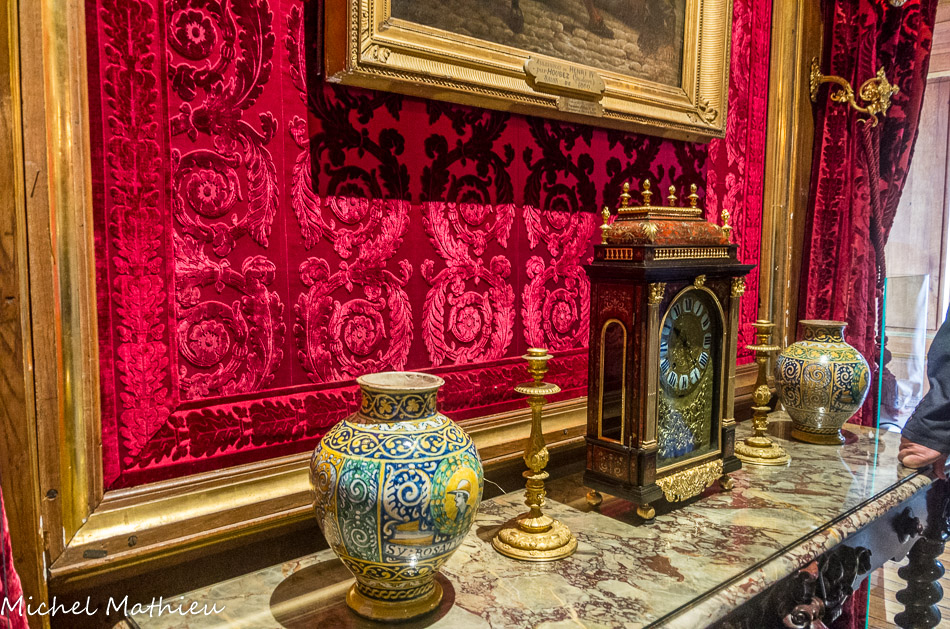 Le grand salon. Aménagé en 1842 et meublé par Jeanselme, le grand salon est décoré de tapisserie des « Mois Lucas » appartenant à deux suites différentes, toutes deux tissées au Gobelins, l'une au XVIIe siècle, l'autre au XVIIIe siècle pour la princesse de Conti. Statue de bronze d'Henri IV enfant, oeuvre de François Joseph Bosio.