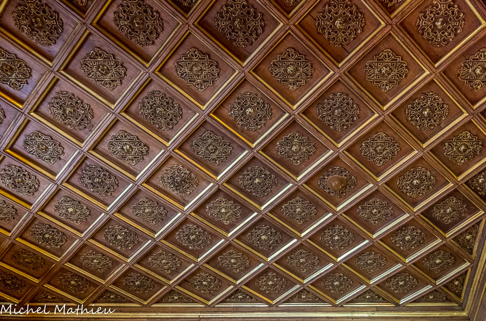 Le plafond à caissons voit s'alterner les chiffres dorés à l'or fin des grands-parents d'Henri IV.
