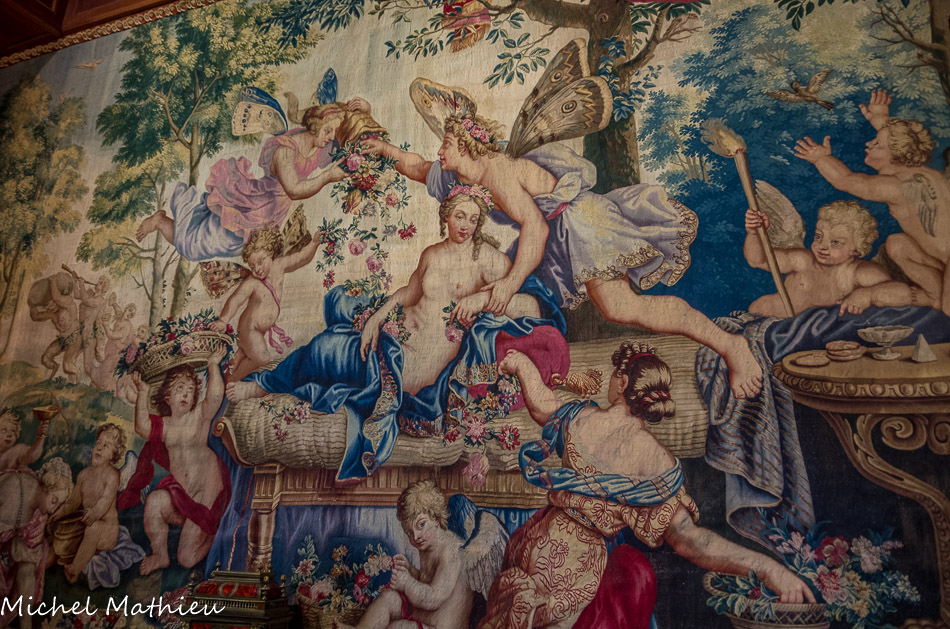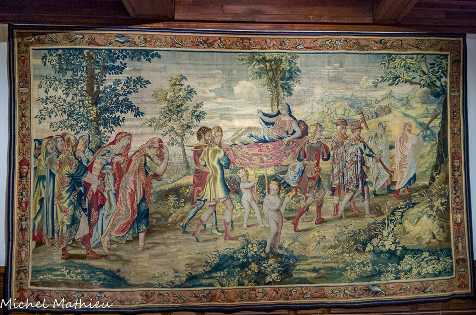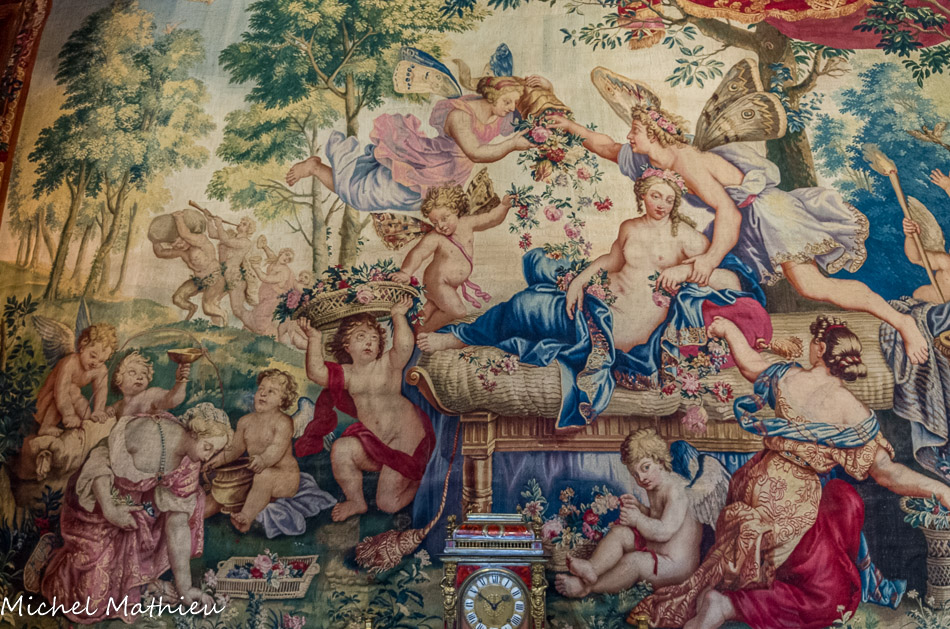 "Psyché portée sur la montagne", une des cinq tapisseries de "l'Histoire de Psyché", tissée au XVIIe siècle dans l'atelier parisienne des La Planche, artisans flamands qu'Henri IV avait appelés à Paris. Les cartons de la tenture originale étaient inspirés de dessins de Raphaël.