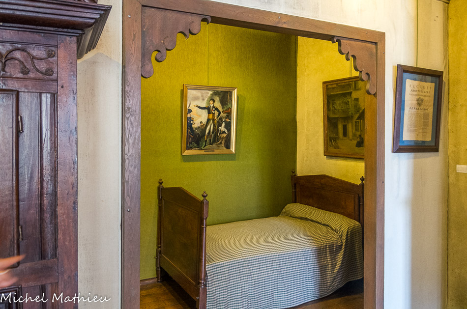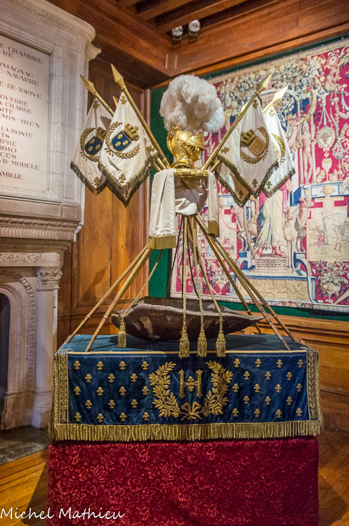 Chambre de Jeanne d'Albret. Louis XVIII fit réaliser l'actuel décor entourant la carapace avec des lances, un casque avec son légendaire panache blanc, des broderies et bannières de France et de Navarre.