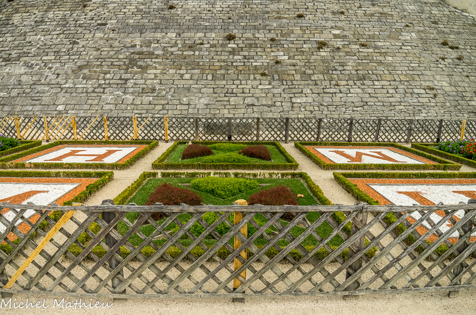 Le mariage d'Henri IV et de Marie de Médicis est évoqué par les lettres H et M décorées de chamotte (brique pilée) et de quartz blanc, au cœur du jardin Renaissance.